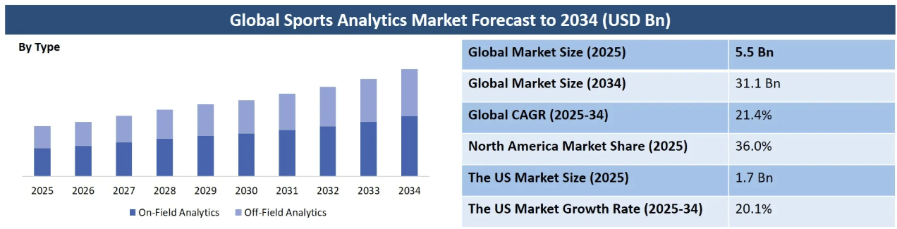 By the Numbers: According to recent research from MarketsandMarkets, the global sports analytics market is projected to grow from ~$5.5bn in 2025 to ~$30bn by 2034.